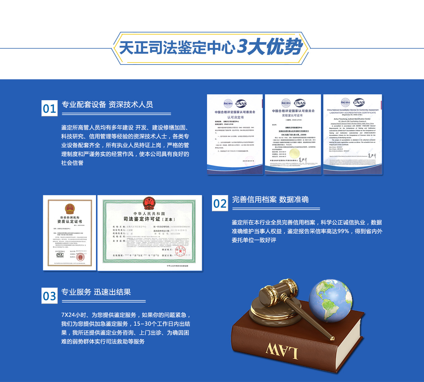 安徽天正司法鑒定中心于2011年10月20日,經安徽省司法廳批準成立;是一所集法醫類鑒定、痕跡鑒定、文書鑒定、聲像鑒定、微量物證鑒定于一體的綜合類的司法鑒定機構。 我中心位于合肥市蜀山區井崗路與甘泉路交口CBC拓基拓基廣場B座5樓、6樓,職場面積近2000平方米,配備技術人才,建有鑒定實驗室及儀器設備。截止目前,我中心有司法鑒定人53名,具有中級以上技術職稱的36名;并建有安徽天正司法鑒定中心實驗科研中心、法醫毒物實驗室、法醫物證實驗室、電子數據實驗室、法醫病理實驗室、微量物證實驗室、文檢實驗室等,同時與各大高校建立校企合作關系,提供實習實訓平臺。